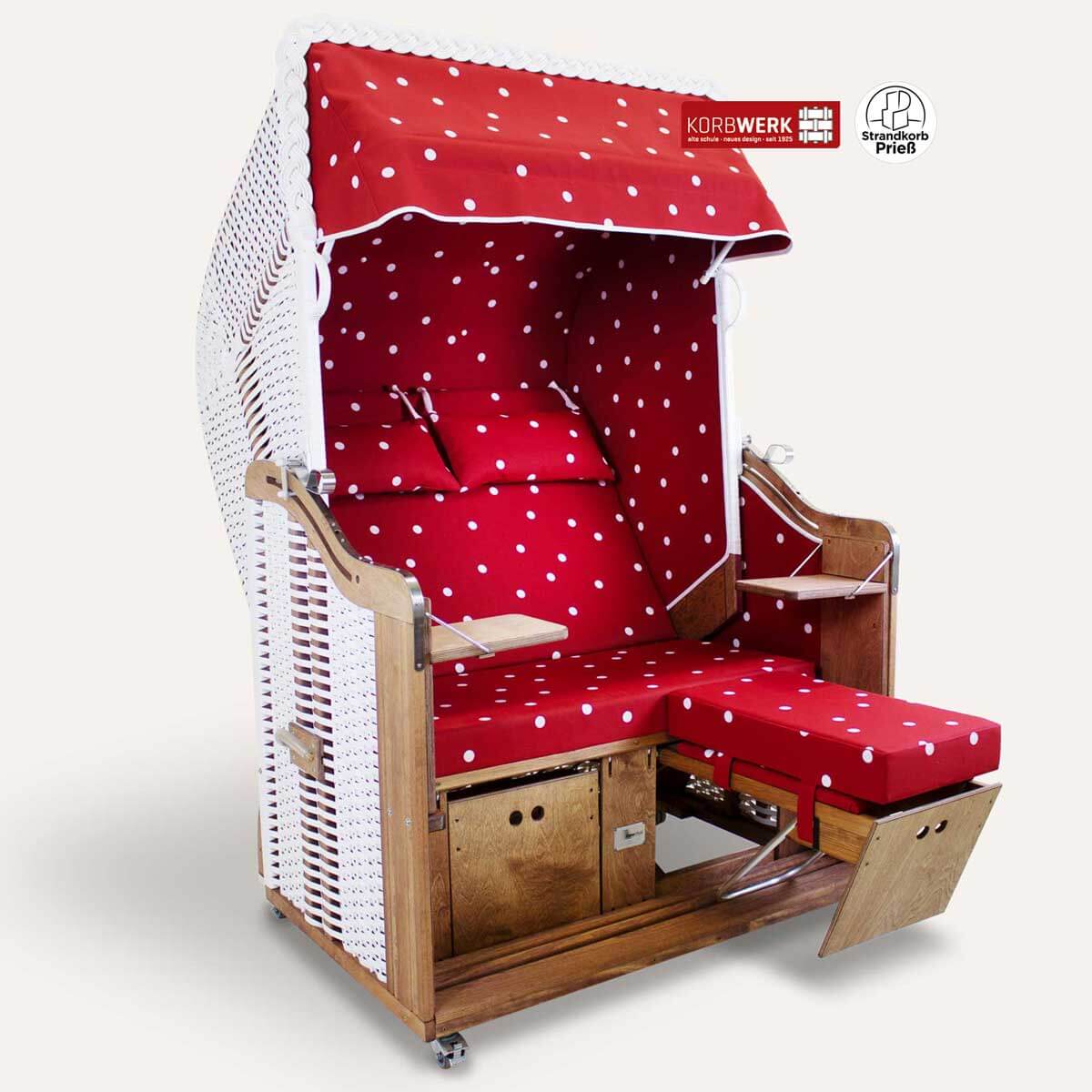 Mit seinen Maßen von 125 × 165 × 89 cm und einem Gewicht von ca. 80 kg bietet er genügend Platz für zwei Personen. Unter der markanten roten Haube mit weißen Punkten überzeugt der Strandkorb durch sein robustes, fein lasiertes Kiefernholz aus heimischen Wäldern und ein außergewöhnliches Stoffdesign.