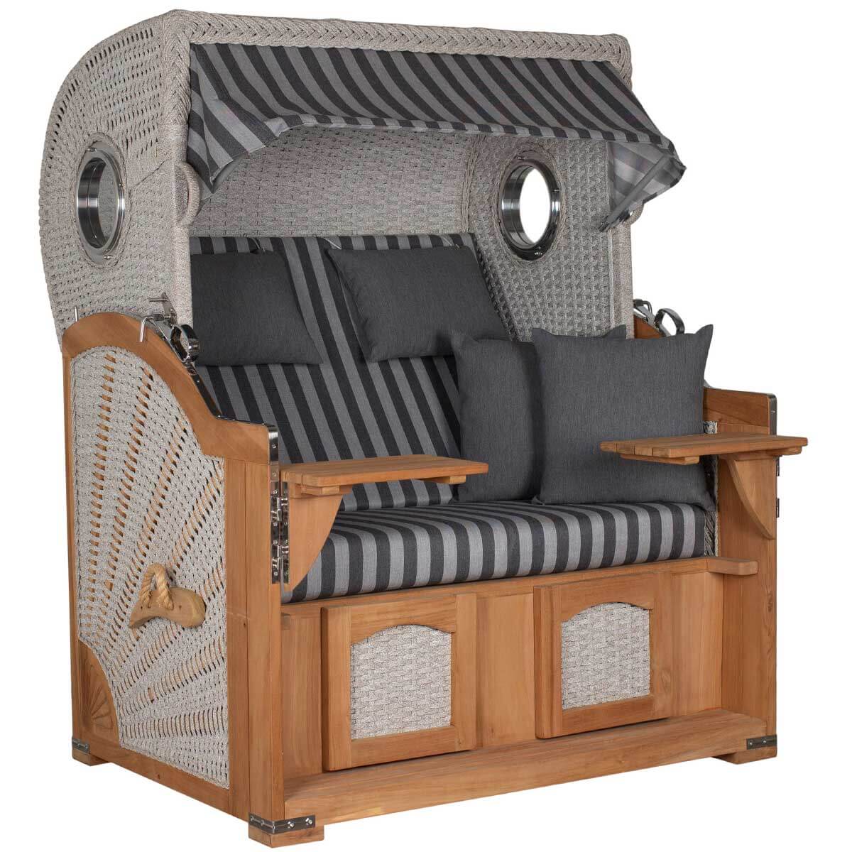 Der Aruba kombiniert naturbelassenes, nicht geöltes Teakholz mit modernem Rope-Kordelgeflecht (15 mm) in ivory. Maritime Aluminium-Bullaugen sowie verzinkte Beschläge setzen elegante Akzente und vervollständigen das hochwertige Gesamtbild. Die sorgfältige Verarbeitung spiegelt die handwerkliche Qualität wider, für die die deVries PURE® Serie bekannt ist.