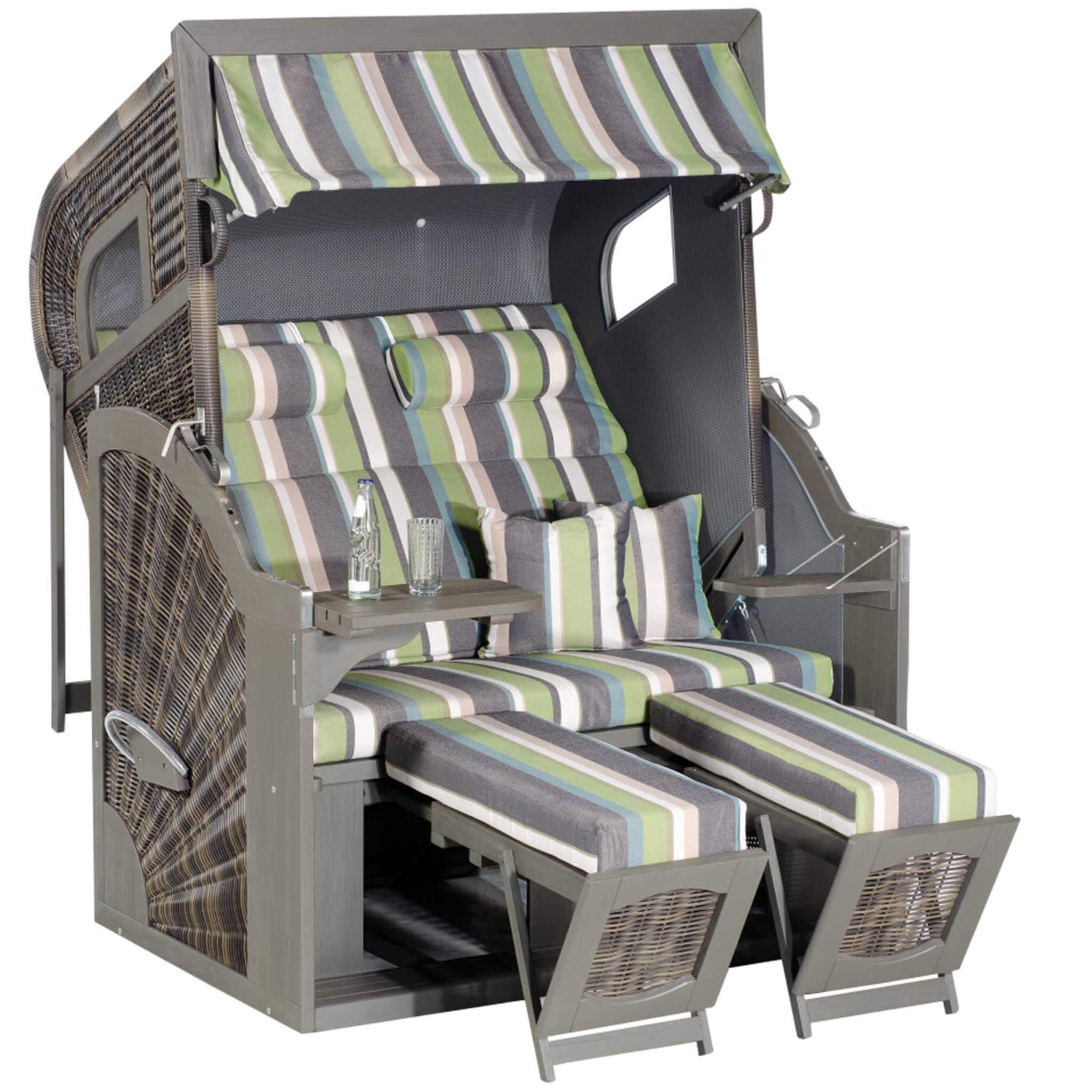 Der Strandkorb Rustikal 405 Z Comfort XL (Modell 1226) ist ein extrabreites, komfortorientiertes 3/4-Liegemodell in Ostseeform und verfügt über elegante seitliche Bullaugen, die dem Strandkorb eine hochwertige, maritime Optik verleihen.