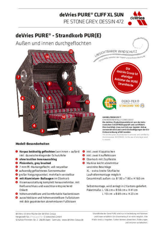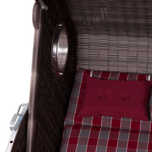 Relaxen Sie in Ihrem Garten im Strandkorb deVries PURE® Cliff XL SUN mit Bullaugen! Dieser exklusive 2-Sitzer vereint modernen Komfort mit klassischem Strandkorb-Charme. Das Zusammenspiel von grau gebürstetem Pinienholz, dem wetterfesten PE-Geflecht in stone grey und dem eleganten Dessin 472 in Rot und Hellgrau kariert, schafft eine einzigartige und stilvolle Optik.