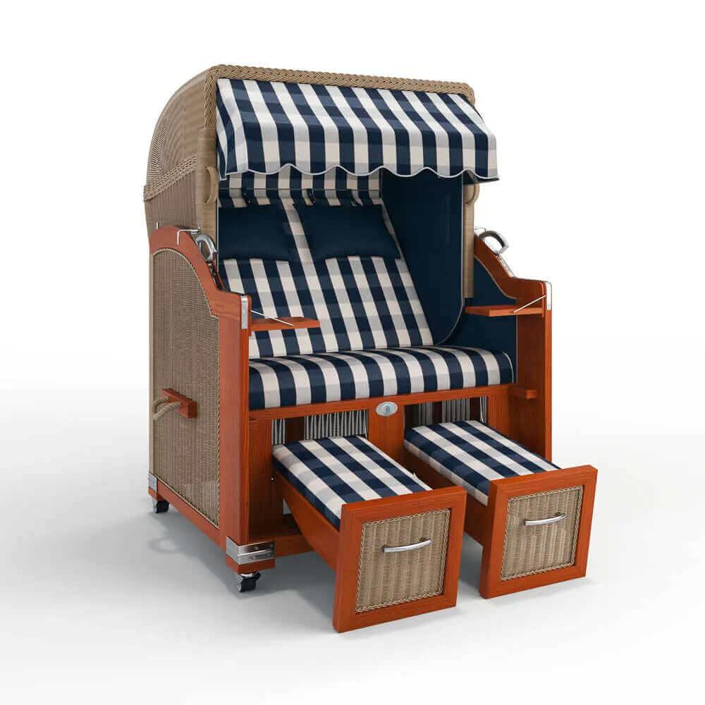 Der Strandkorb Hörnum ist ein hochwertiger, kompakter 2-Sitzer aus edlem Mahagoniholz und eine attraktive, preisbewusste Alternative zum Luxusmodell Keitum. Durchdachte Details wie herausziehbare Fußablagen, Zeitungs- und Handytaschen sowie zwei integrierte Klapptische machen ihn zum unkomplizierten Rückzugsort für Garten, Terrasse oder Balkon.