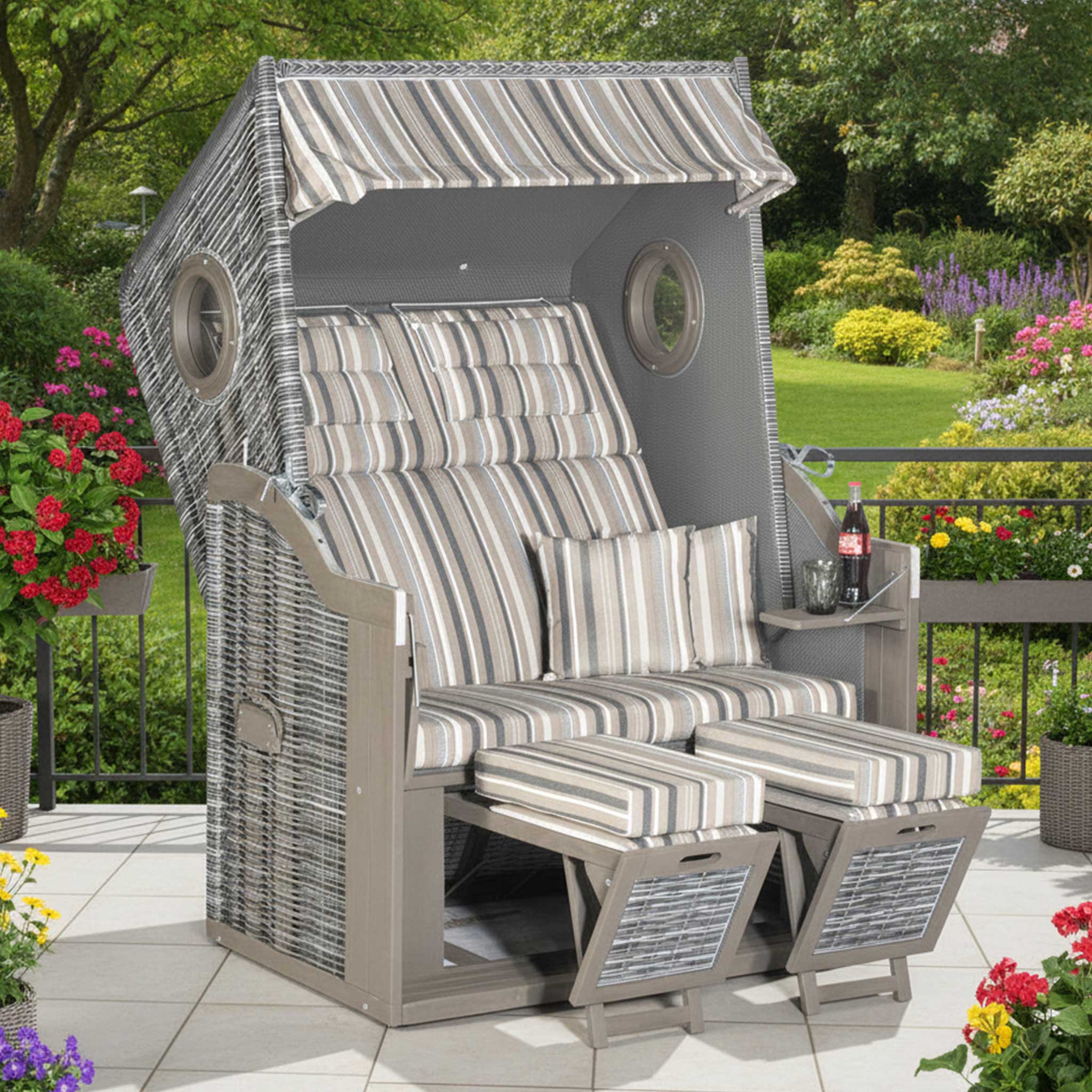 Der Strandkorb Rustikal 34 Z Bullauge (Modell 1233) ist ein hochwertiges Halbliegemodell in moderner Ostseeform und überzeugt durch seine markanten seitlichen Bullaugen. Das PE-Kunststoffgeflecht in 8 mm Feinoptik (Farbe Onix) verleiht dem Strandkorb eine elegante, zeitlose Erscheinung. Die Kombination aus grau lasiertem Pinienholz, wetterfestem Textilen-Innenausschlag und einer herausnehmbaren Kissengarnitur sorgt für hohen Komfort und eine langlebige Nutzung im Außenbereich.