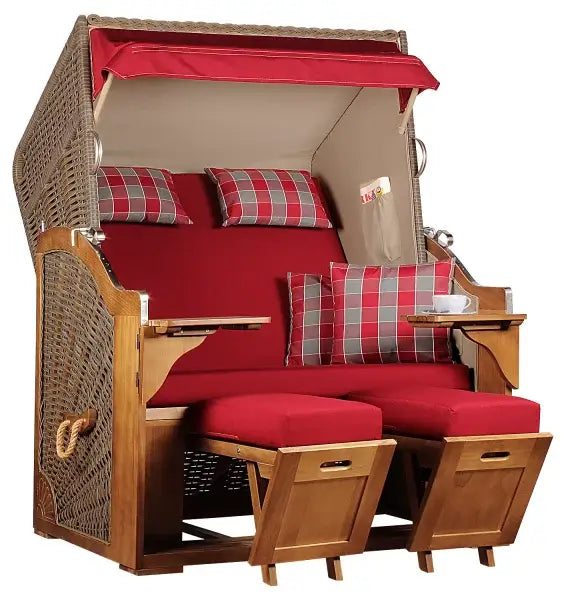 Sie sind auf der Suche nach einem Strandkorb, der robust und auch gleichzeitig preiswert ist? Unser Zweisitzer-Strandkorb in der begehrten Ostseeform besticht durch die Verarbeitung widerstandsfähiger Materialien sowie eine hochwertige Ausstattung für höchsten Komfort. Durch seine Optik in Erdtönen besticht dieses zeitlose Outdoor-Möbel durch eine schöne Optik, die mit jeder Terrassen-, Balkon- oder Gartengestaltung harmoniert. Der Korb aus PE-Geflecht ist UV- und witterungsbeständig, dadurch behält dieser stilvolle Zweisitzer in der Ostseeform lange sein makelloses Aussehen. Der Rahmen ist aus Pinienholz im Farbton braun verarbeitet. Sein schmutz- und wasserabweisender Markisenstoff aus 100 % Polyester macht ihn zudem zu einem äußerst pflegeleichten Begleiter.