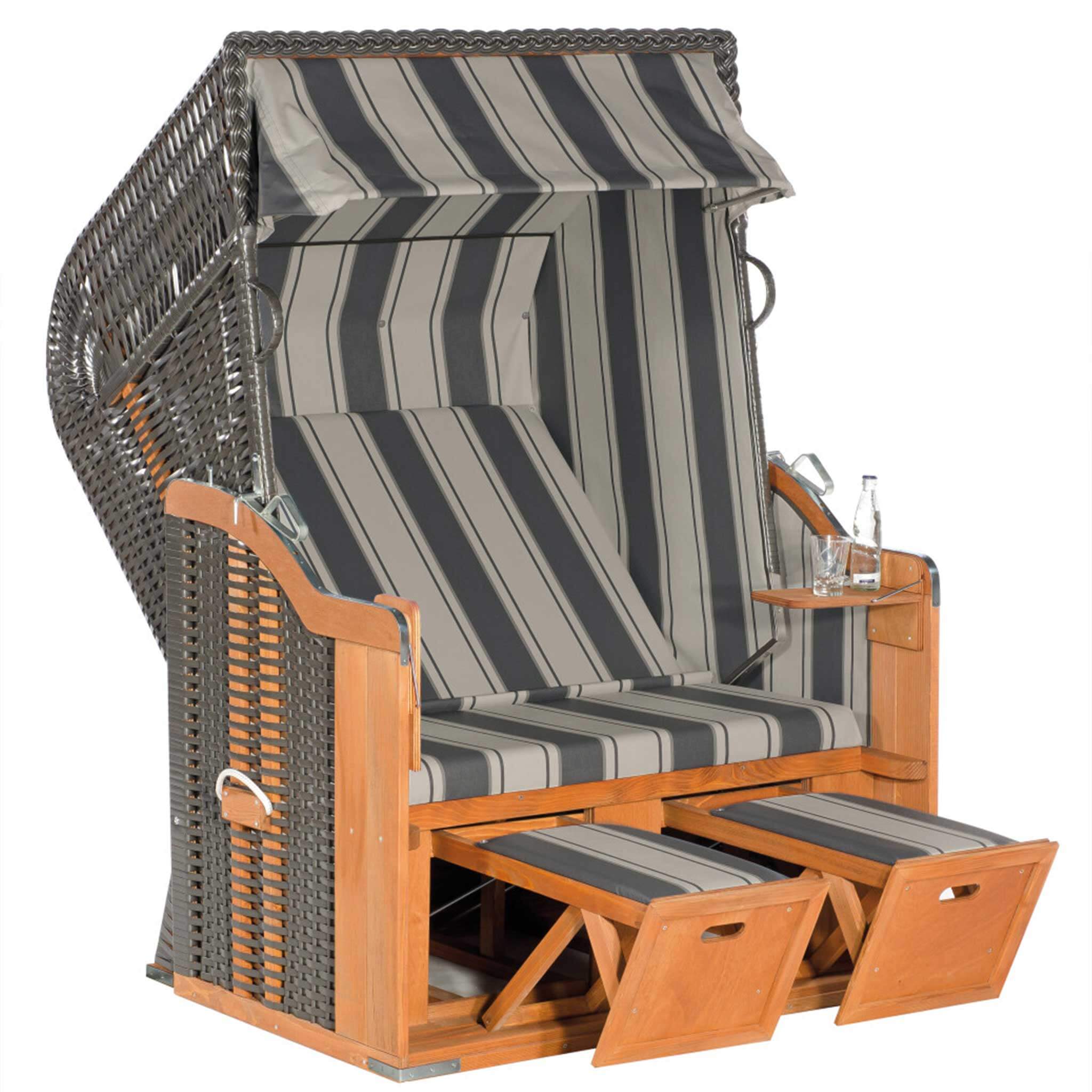 Der Strandkorb Rustikal 250 Basic (Modell 640) ist ein robustes Halbliegemodell in Ostseeform, gefertigt aus pflegeleichtem PVC-Kunststoffgeflecht in Anthrazit. Die moderne, dunkle Optik passt ideal zu zeitgemäßen Terrassen und Gartenbereichen.
