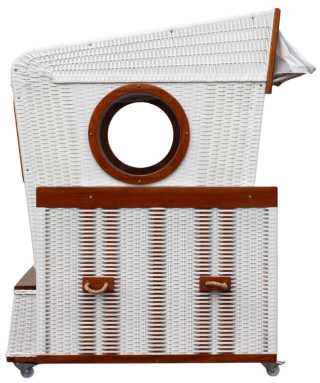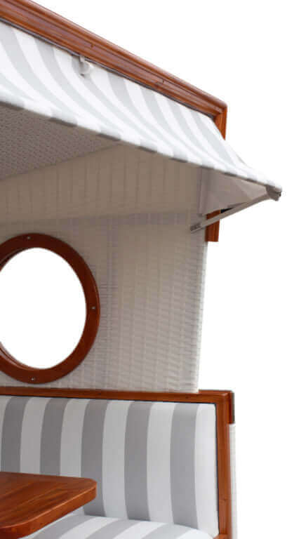 Der Strandkorb ist aus pflegeleichtem und witterungsbeständigem Material gefertigt. So kann er ganzjährig im Freien genutzt werden.