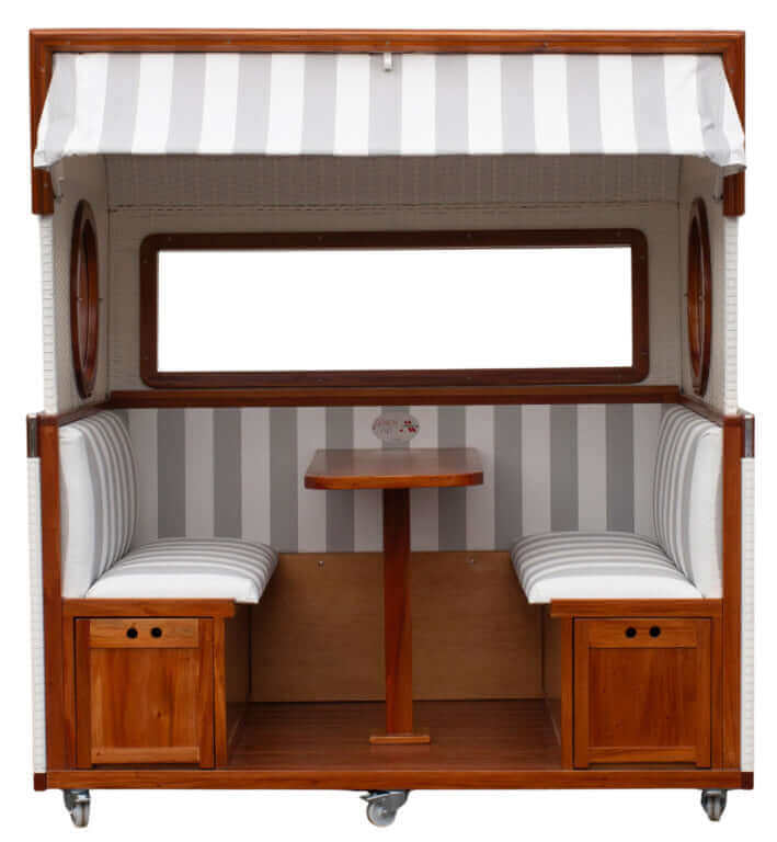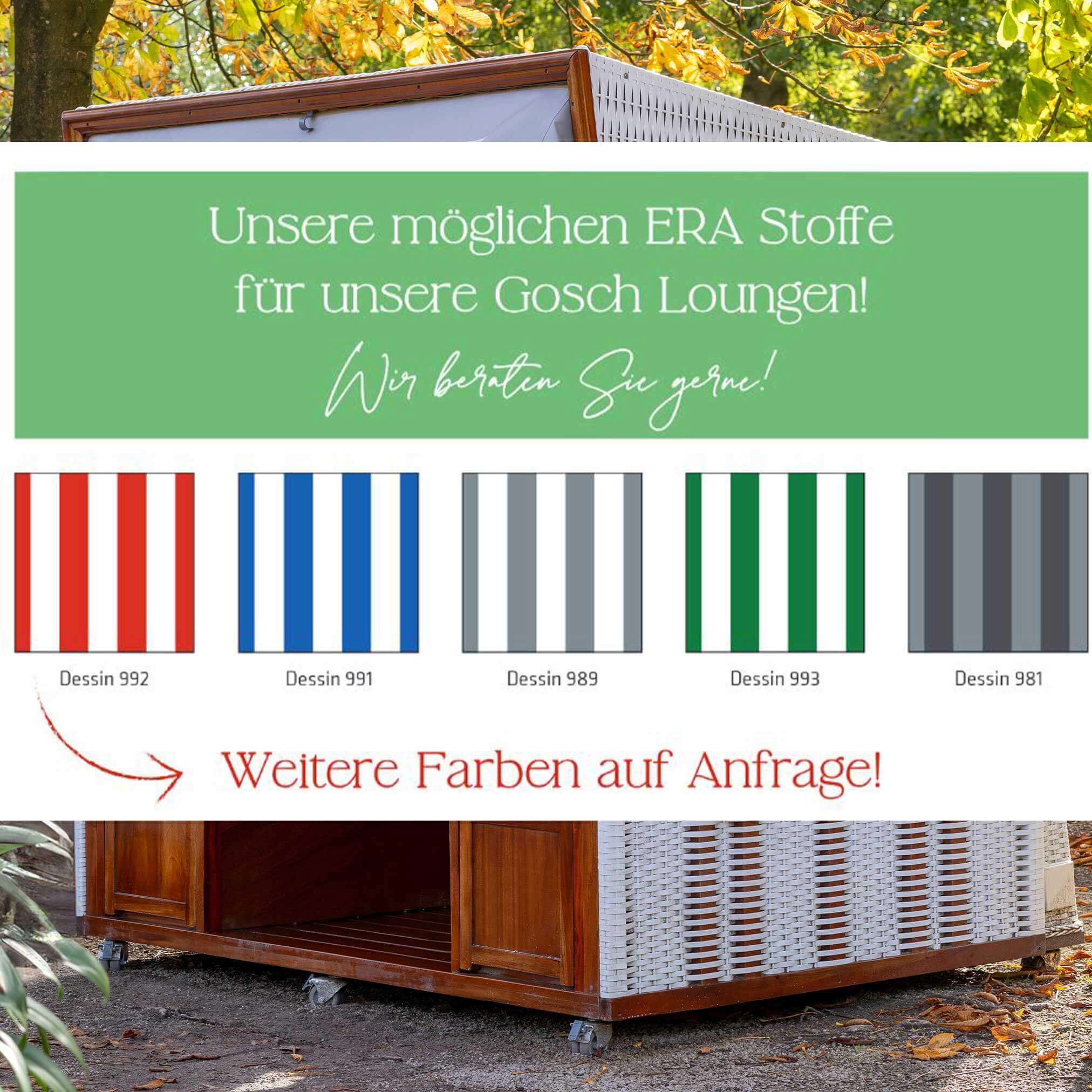 Die Gosch Lounge von deVries ist ein exklusiver Strandkorb, der durch sein einzigartiges Design und seine komfortable Ausstattung besticht. Er ist ideal für gesellige Stunden mit Freunden und Familie und bietet Platz für bis zu sechs Personen.