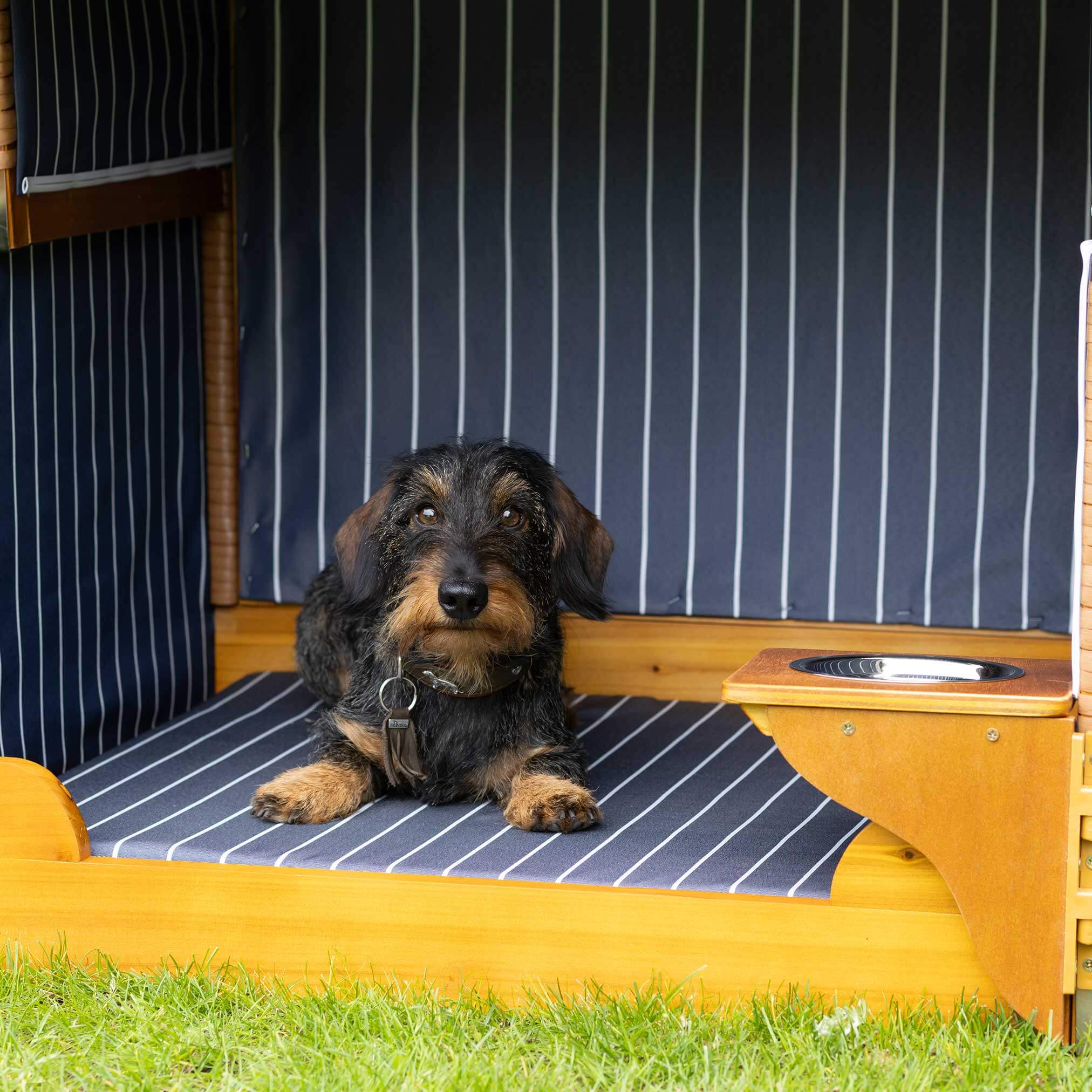 Entspannen Sie sich und Ihr Haustier mit unserem Hundestrandkorb PE natur Dessin blau gestreift.