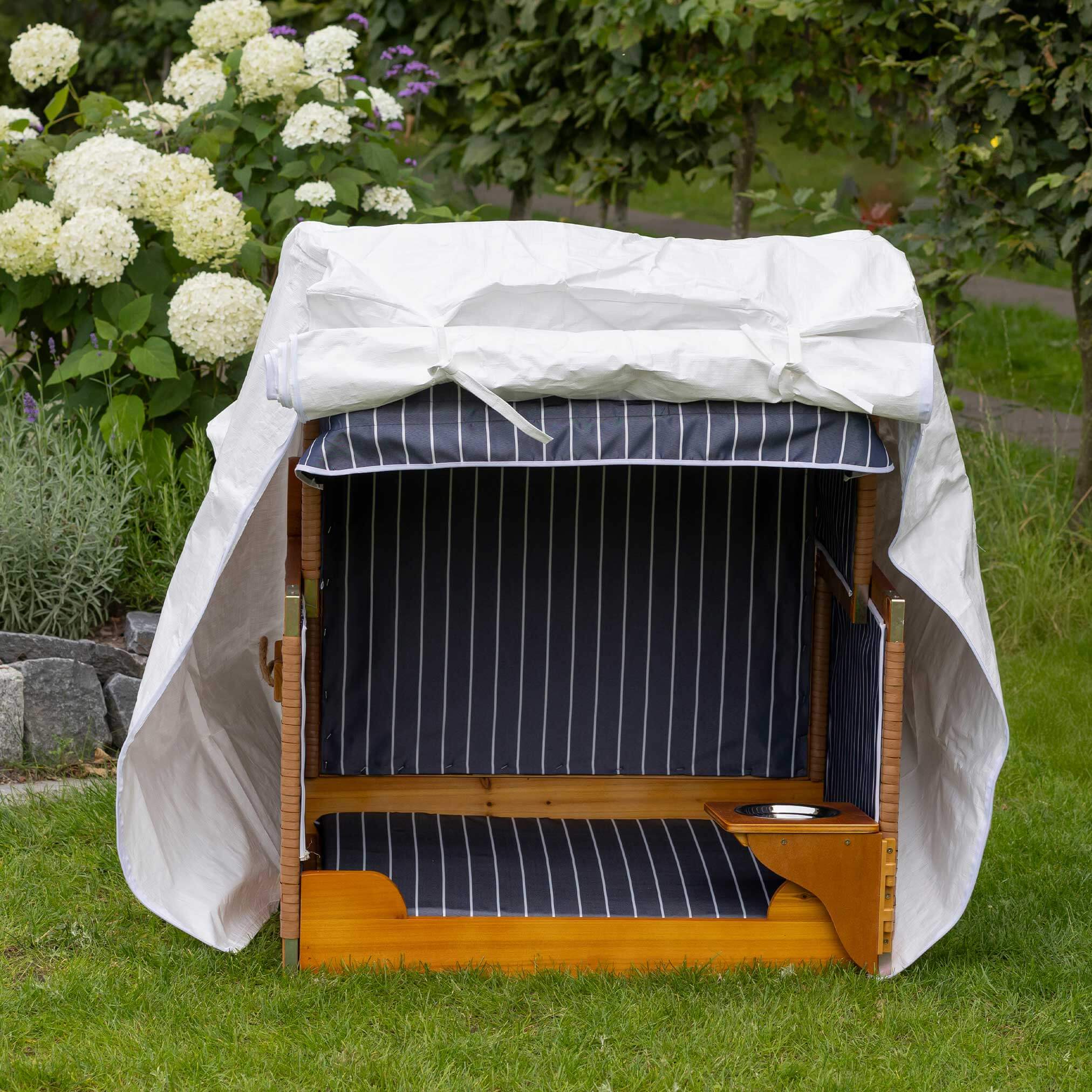 Genießen Sie luxuriösen Komfort am Strand, während Ihr treuer Begleiter in unserem exklusiven Strandkorb entspannt. Der robuste PE-Korb bietet Schutz vor Sand und Wind, während das elegante grau gestreifte Design ein echter Hingucker ist. Perfekt für gemeinsame Stunden am Meer oder im Garten.
