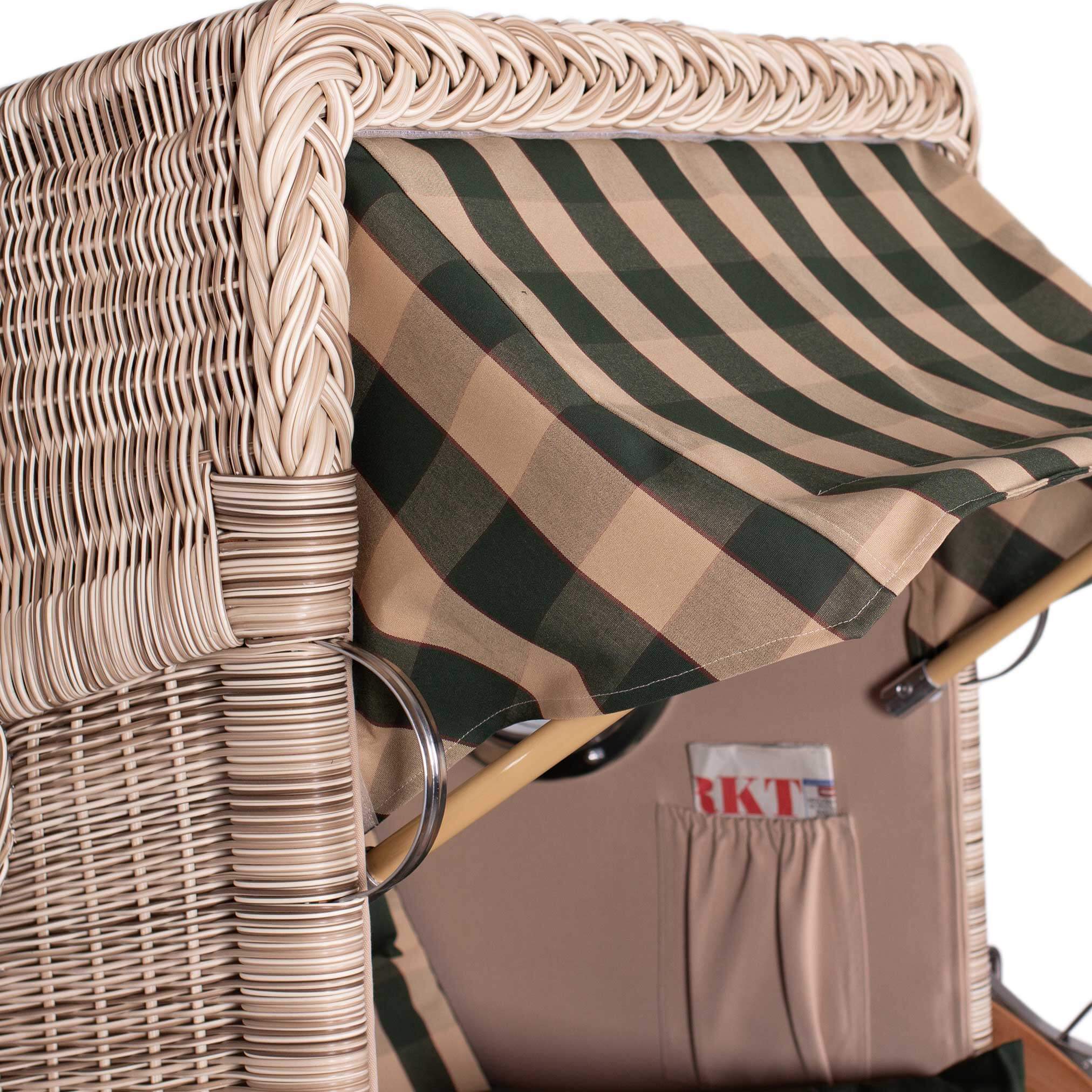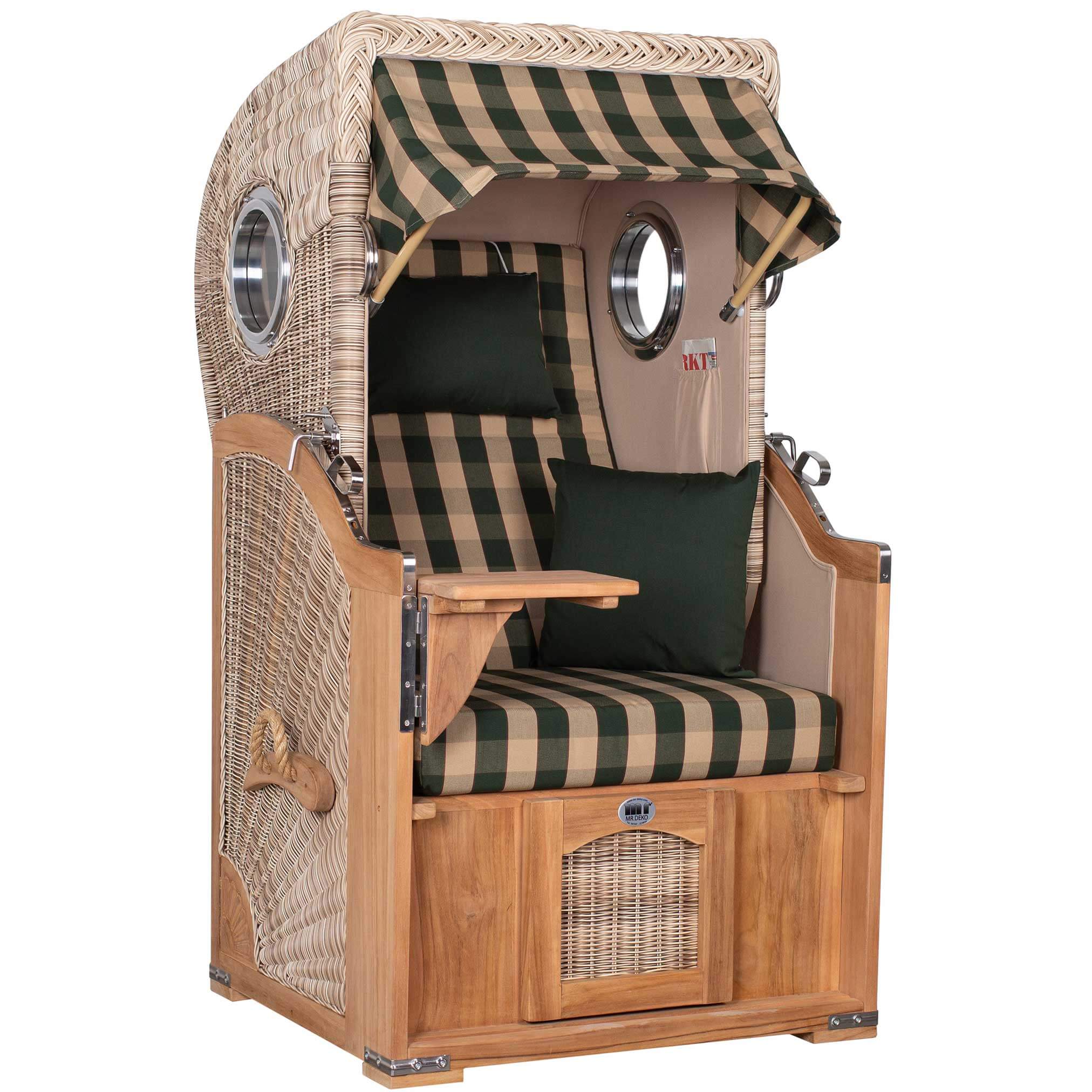 Mit dem Single Strandkorb Düne Teak PE Shell hält maritime Ferienstimmung auf Ihrer Terrasse Einzug. Massives Teak-Holz und ein edles PE-Geflecht in shell verleihen diesem eleganten Einsitzer eine helle und sommerlich freundliche Ausstrahlung. Die robusten Materialien machen diesen Premium-Strandkorb zu einem langlebigen und pflegeleichten Outdoor-Möbel. Mit Fußstützen, die ausziehbar sind, sowie einer dicken Polsterung und luxuriösen Ausstattung ist dieser Volllieger besonders hochwertig und sorgt dafür, dass Sie es sich an warmen Tagen unter freiem Himmel so richtig gemütlich machen können.