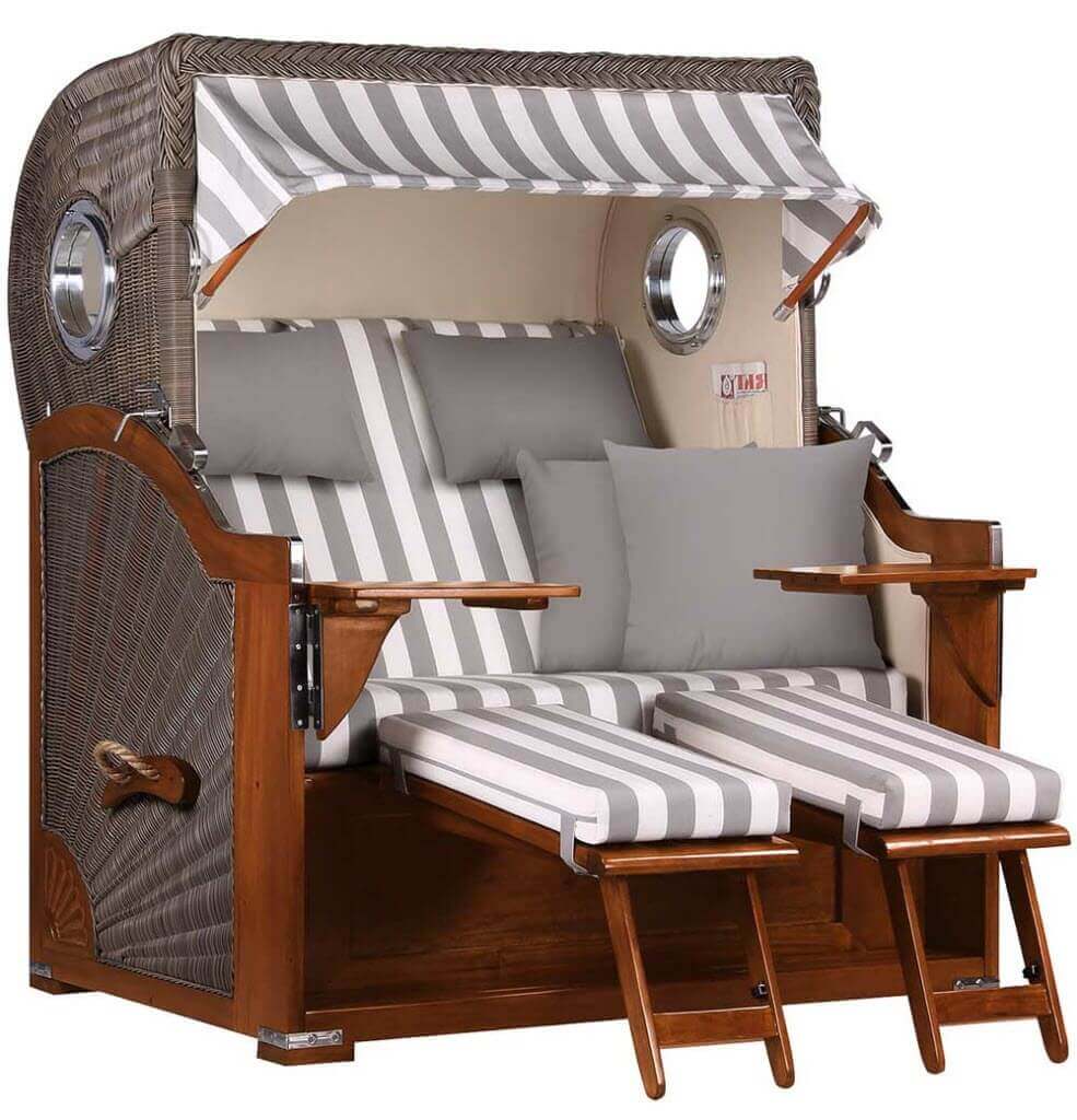 Kostbare Mahagoni-Holzarbeit und ein überbreites PE-Geflecht in Grau liefern ultimativen Komfort für Ihren Strandkorb. Verwöhnen Sie sich selbst mit samtweichen Polsterungen und Kissen - eine schier endlose Auswahl an Designs steht Ihnen zur Verfügung und ermöglicht lang anhaltenden Genuss dank der hochwertigen Ausstattung.