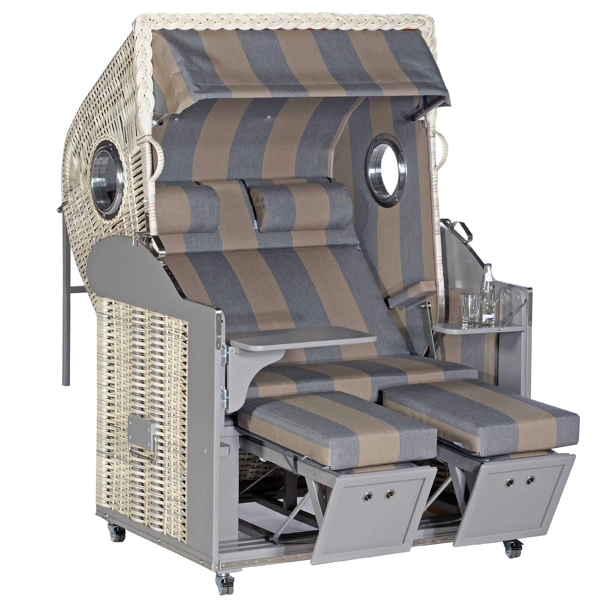 Dank der umfangreichen Komfortausstattung – von der Markise über Fußpolster bis zu den Fahrrollen mit Feststellern – ist dieser Strandkorb die perfekte Wahl für Terrasse, Garten oder Ferienhaus.