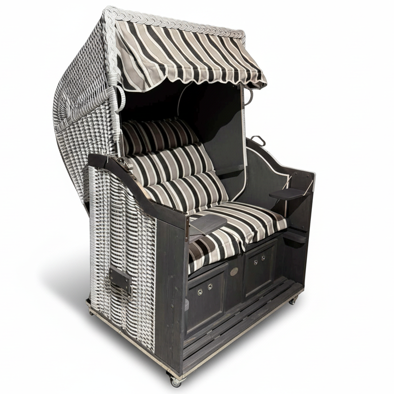 Strandkorb Sonnenpartner Modell Classic PE-Geflecht white washed, Holz grau lasiert, Dessin Filo Tomba 720 grau schwarz