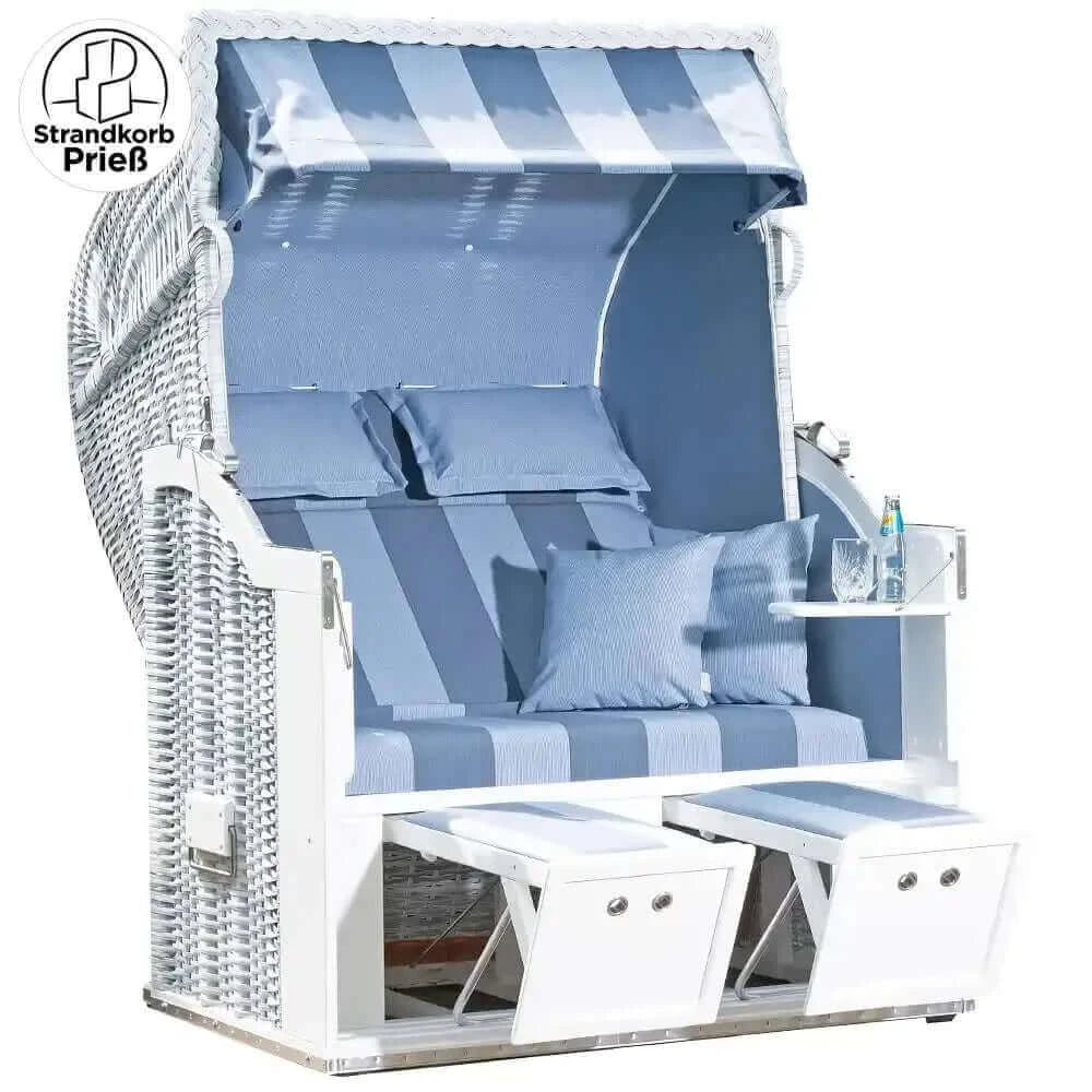 8168 Strandkorb Sonnenpartner Modell Classic PE Geflecht white-washed, Holz weiss, Dessin 19 blau wie abgebildet