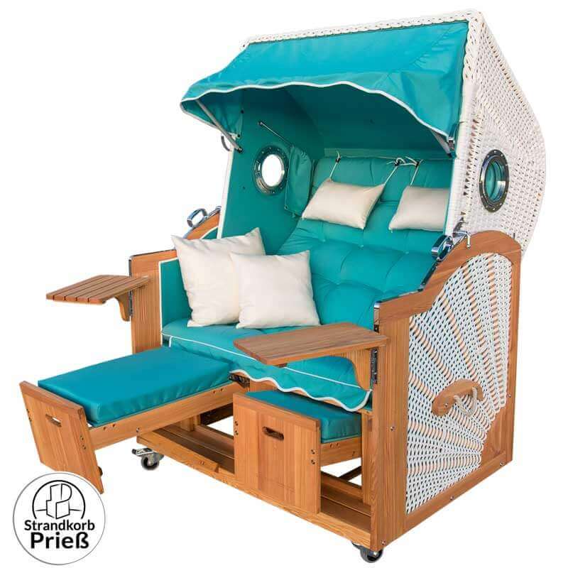 6028 Strandkorb Prieß, Modell Meister, Foto zeigt Lärche Holz, PE-Geflecht weiss, Größe wählbar, Stoff-Dessin wie abgebildet