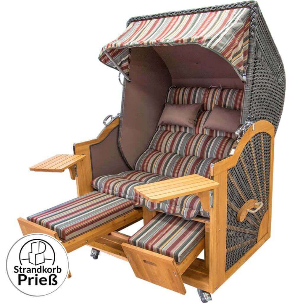 6045 Strandkorb Prieß, Modell Meister, Foto zeigt Lärche Holz, PE-Geflecht dunkelgrau, Größe wählbar, Stoff-Dessin wie abgebildet