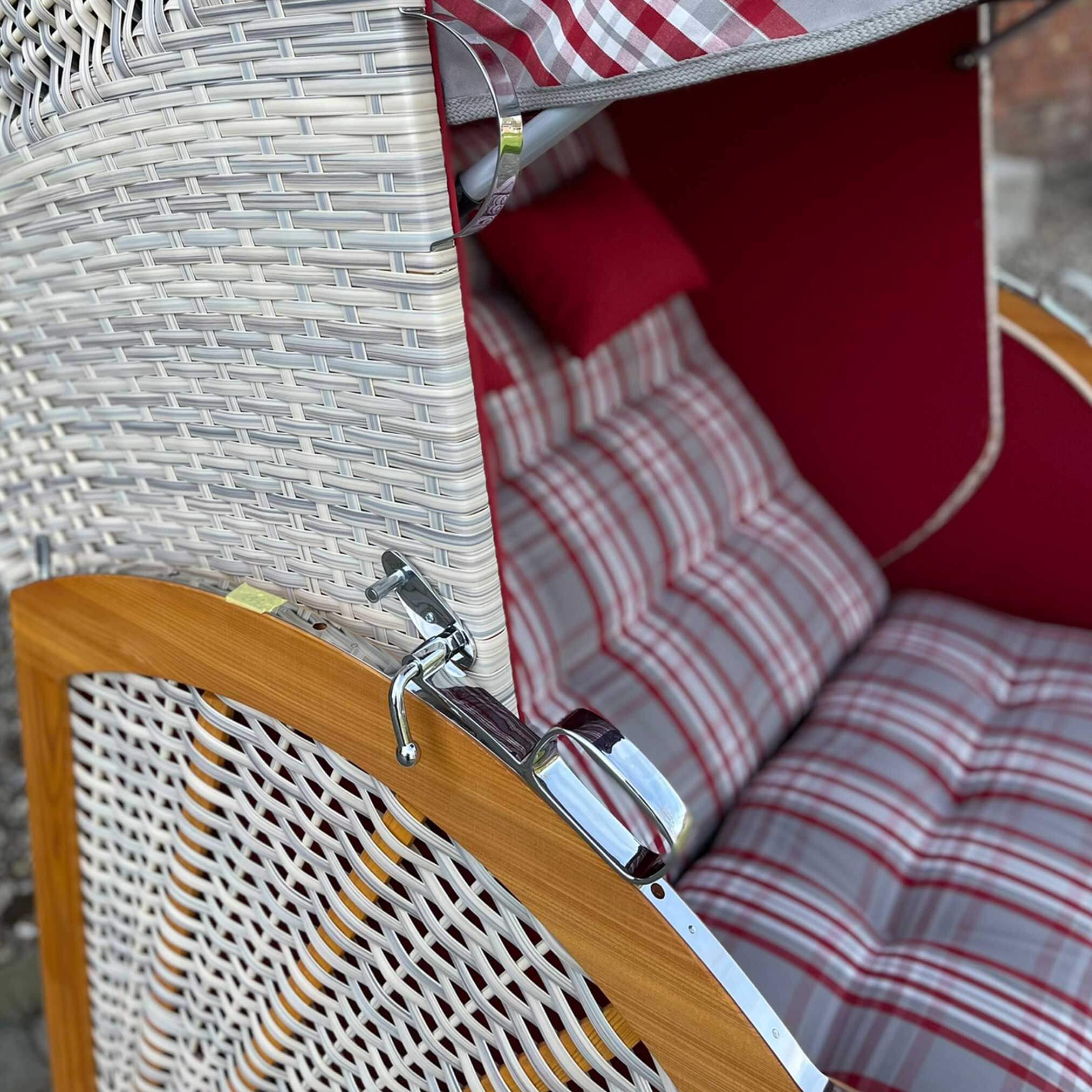 A111 Strandkorb Prieß Modell Meister Lärche Holz, PE Geflecht taupe, Dessin rot taupe, 135 cm