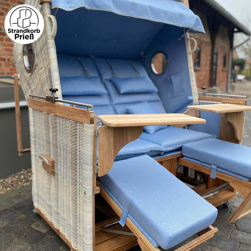Entdecken Sie den ultimativen Strandgenuss mit dem Strandkorb Sylt Teak 2,5 XL PE-Rundgeflecht antik-weiss Dessin Panama Ice. Dieser luxuriöse Strandkorb vereint Stil, Komfort und Qualität in einem einzigartigen Design.