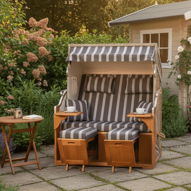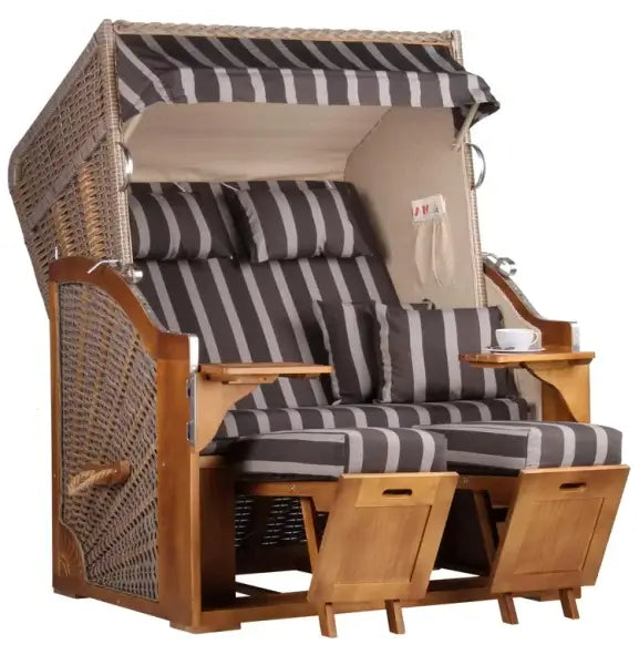 Der Strandkorb Schleswig Pinienholz in PE mokka - nostalgische Eleganz und moderne Ausstattung