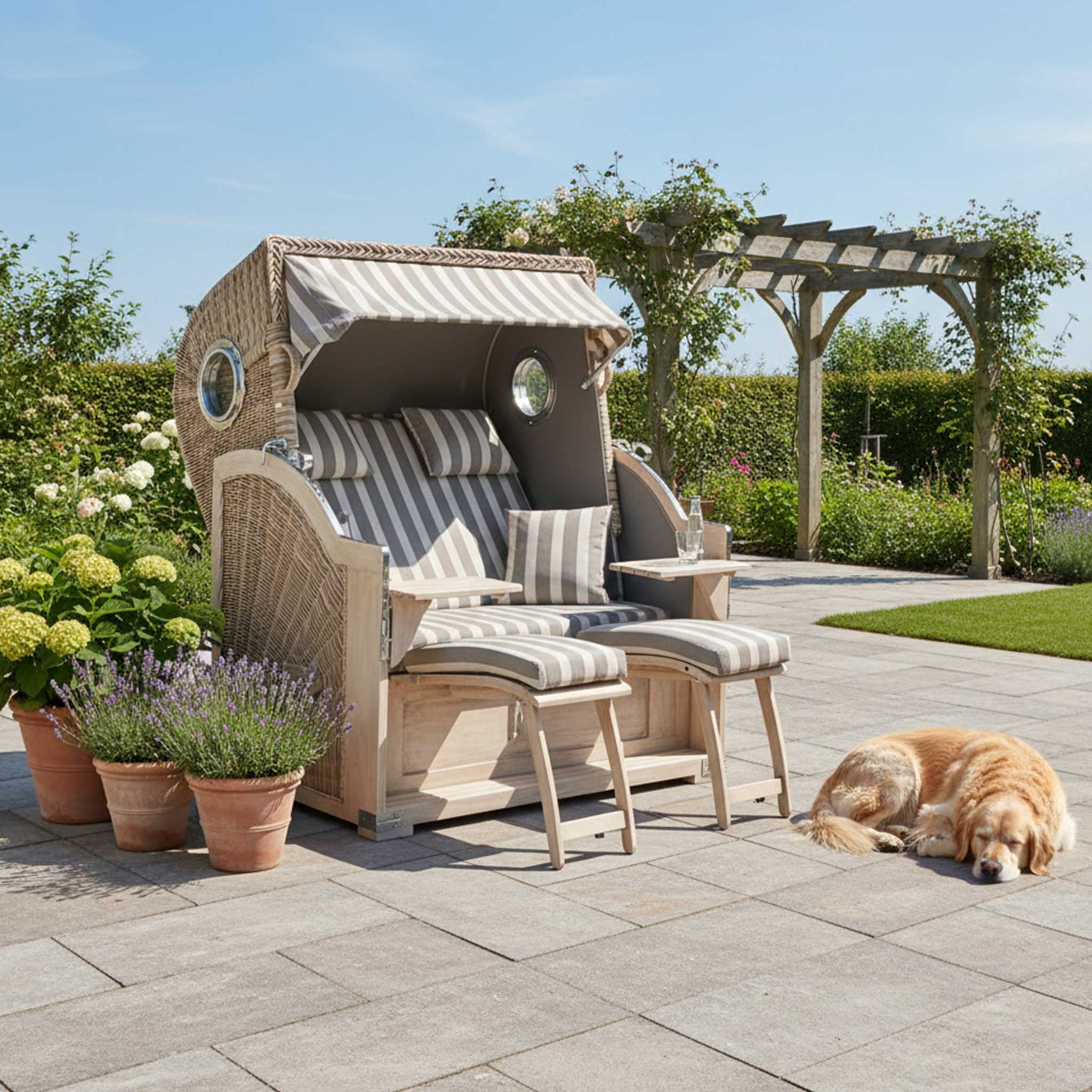 Dieser Premium-Strandkorb verbindet eine extrem stabile Konstruktion mit exklusiver Optik. Das helle Antik-Weiß-Geflecht, kombiniert mit Mahagoniholz in smoke-white, schafft einen modernen, edlen Look. Die extradicke Polsterung, Bullaugen, Bistrotische und der vollmontierte Lieferumfang machen den Rustikal 500 Plus Comfort zu einem luxuriösen Highlight für hochwertige Gärten und Terrassen.