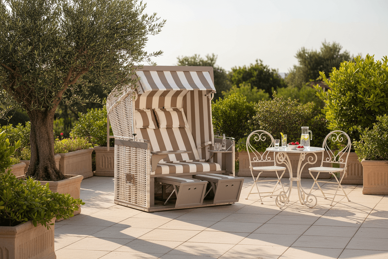 Ein sonniger Morgen, die Terrasse bietet eine herrliche Aussicht auf den ruhigen Garten, der in wunderschönem Licht erstrahlt. Der Strandkorb "Präsident" besticht durch sein elegantes PE-Geflecht in Antik-Weiß, ergänzt durch lackierte Sichtflächen in modernem Taupe auf hochwertigem Mahagoniholz. Der edle Markisenstoff in Beige-Weiß (Stoff 186) fängt die warme Stimmung des Tages perfekt ein. Ideal für eine entspannte Pause mit einer Tasse Kaffee und dem ersten Sonnenstrahl des Tages!