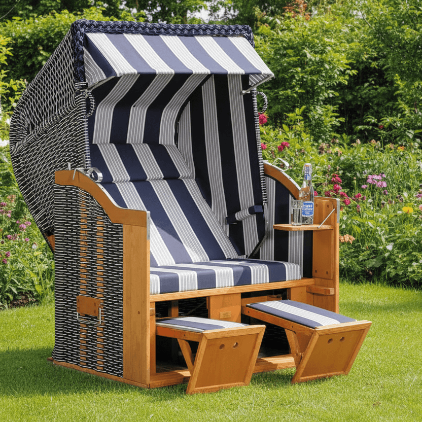8011 Strandkorb Sonnenpartner Modell Classic Geflecht blau mit weissen Nadelstreifen, Holz lasiert, Dessin 118 wie abgebildet