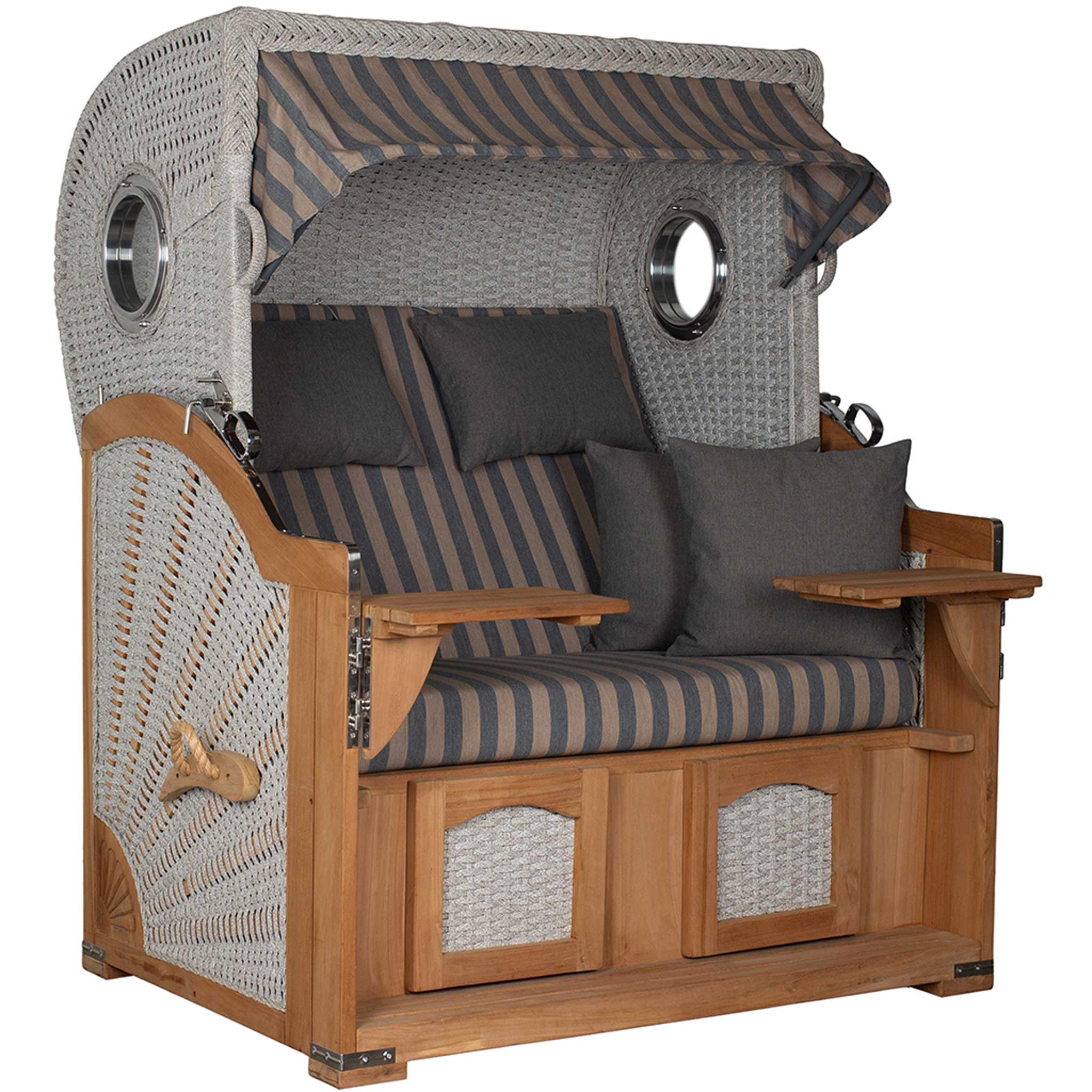 Der Aruba kombiniert naturbelassenes, nicht geöltes Teakholz mit modernem Rope-Kordelgeflecht (15 mm) in ivory. Maritime Aluminium-Bullaugen sowie verzinkte Beschläge setzen elegante Akzente und vervollständigen das hochwertige Gesamtbild. Die sorgfältige Verarbeitung spiegelt die handwerkliche Qualität wider, für die die deVries PURE® Serie bekannt ist.