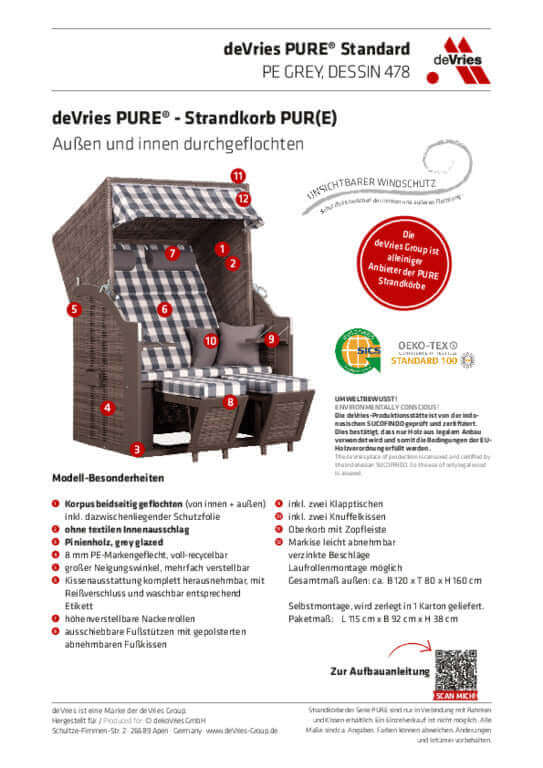 Strandkorb deVries PURE Modell Standard, PE-Geflecht grey, Dessin 478