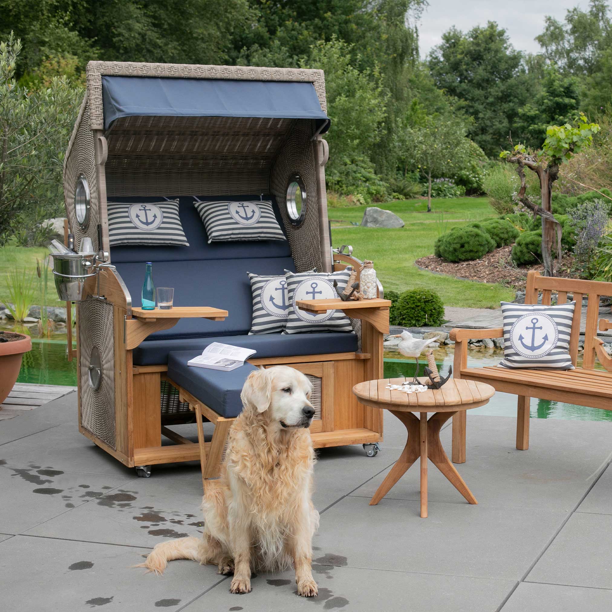 Strandkorb Sailor Teak - mit Bullaugen - PE-Geflecht white kubu im Dessin 198
