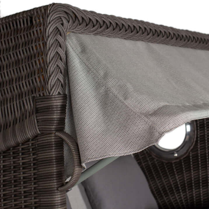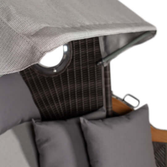 Die Kombination aus hochwertigem Teakholz und dem eleganten Stone Grey Geflecht sorgt für eine ansprechende Optik. Die durchdachte Konstruktion mit verstellbarer Rückenlehne, Fußstützen und Rückholfeder ermöglicht eine entspannte Körperhaltung. Die Bullaugen sorgen für eine angenehme Luftzirkulation.