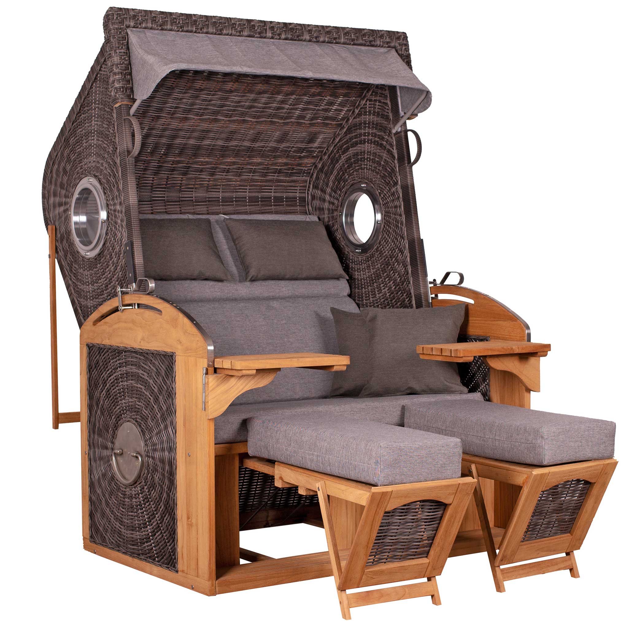 Der Sailor Teak Strandkorb vereint maritime Tradition mit modernem Design. Das hochwertige Teakholz und das edle PE-Geflecht in stone grey verleihen ihm eine elegante Optik. Die charakteristischen Bullaugen sorgen für einen Hauch von Abenteuerlust.