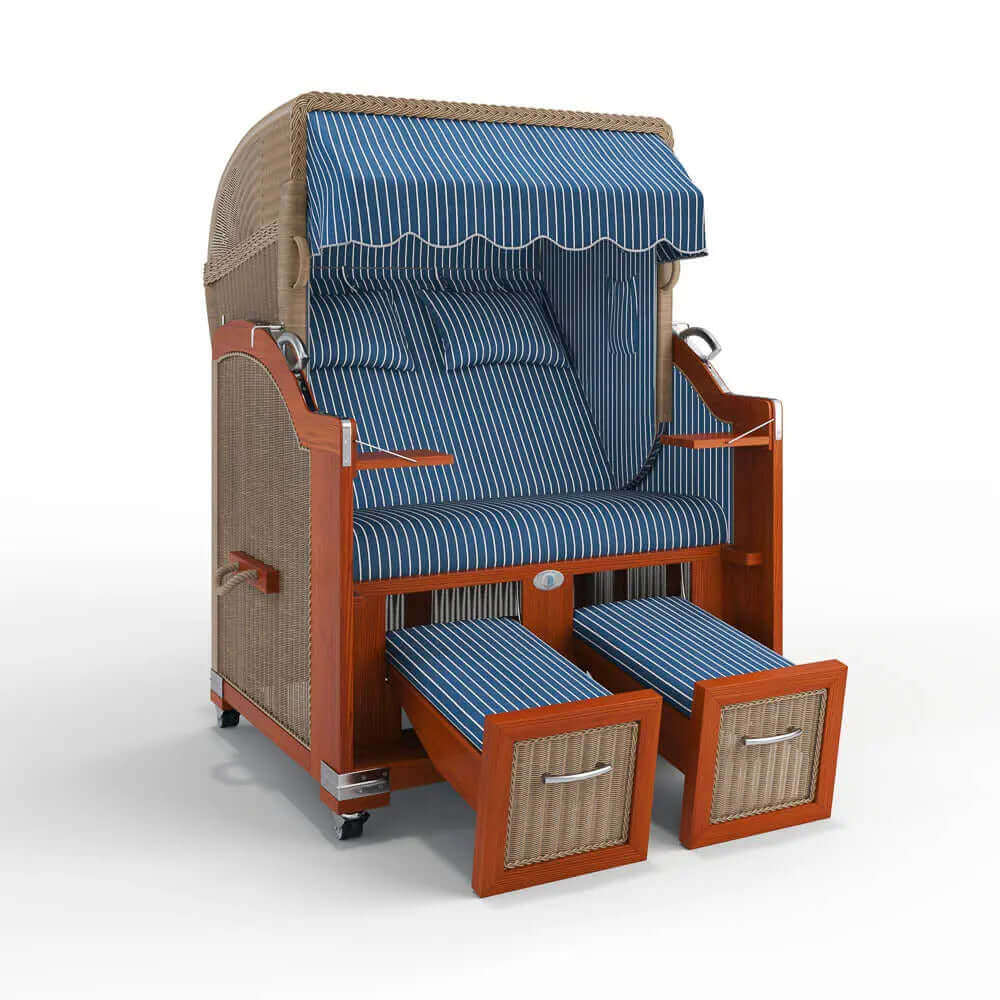 Der Strandkorb Hörnum ist ein hochwertiger, kompakter 2-Sitzer aus edlem Mahagoniholz und eine attraktive, preisbewusste Alternative zum Luxusmodell Keitum. Durchdachte Details wie herausziehbare Fußablagen, Zeitungs- und Handytaschen sowie zwei integrierte Klapptische machen ihn zum unkomplizierten Rückzugsort für Garten, Terrasse oder Balkon.