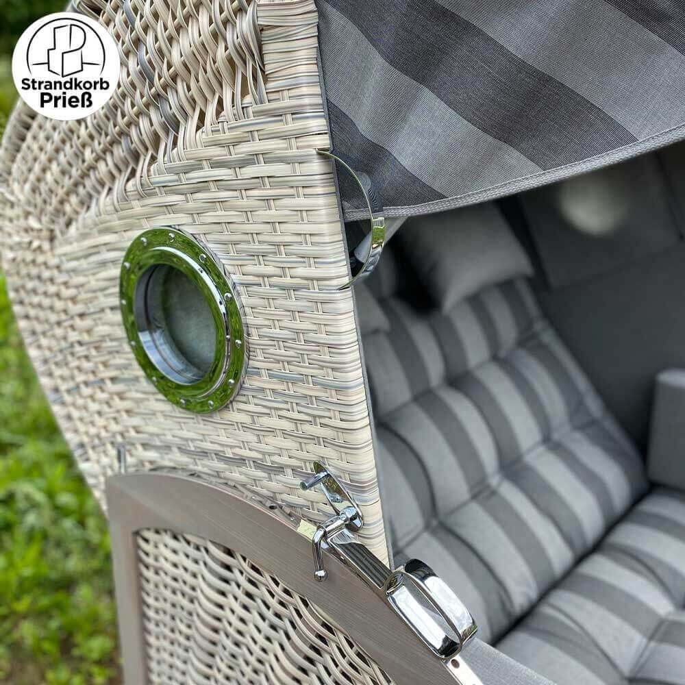 7026 Strandkorb Prieß Modell Meister, Foto zeigt Lärche Holz Vintage grau lasiert, PE Geflecht taupe, Größe wählbar, Stoffdessin wie abgebildet
