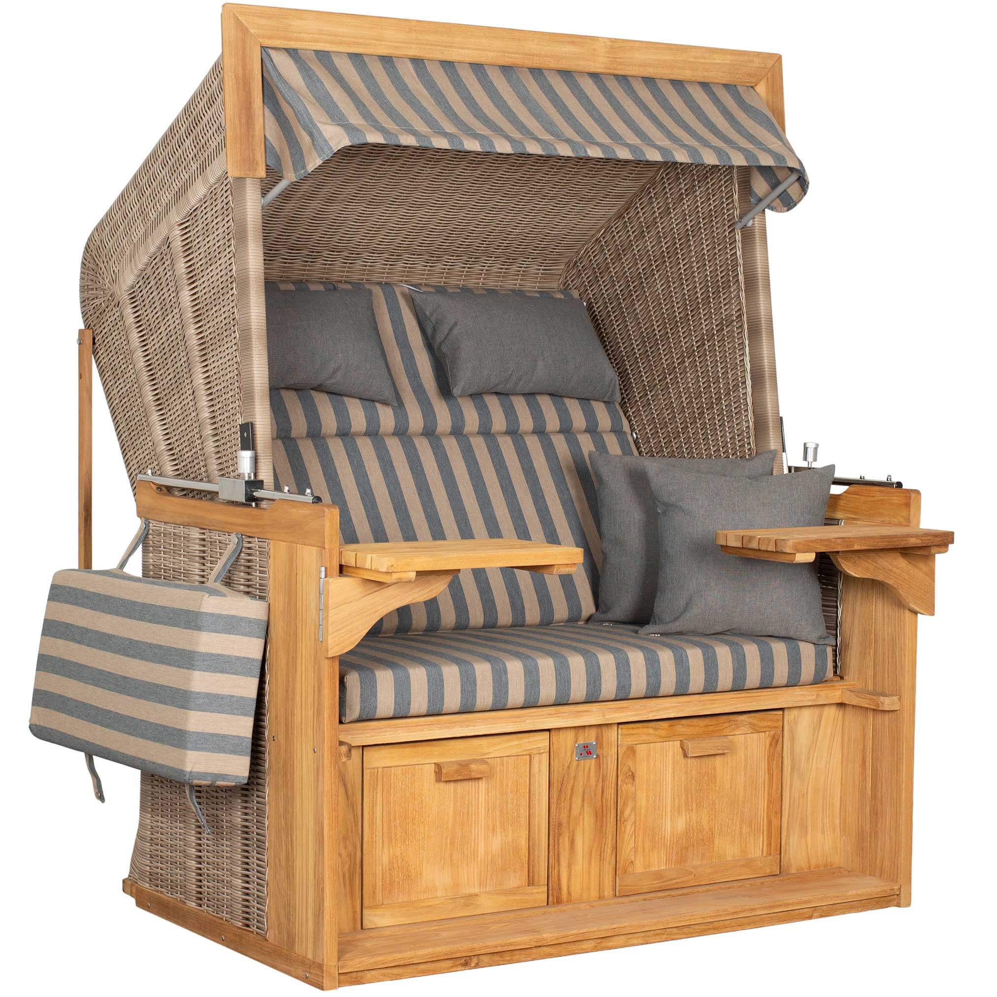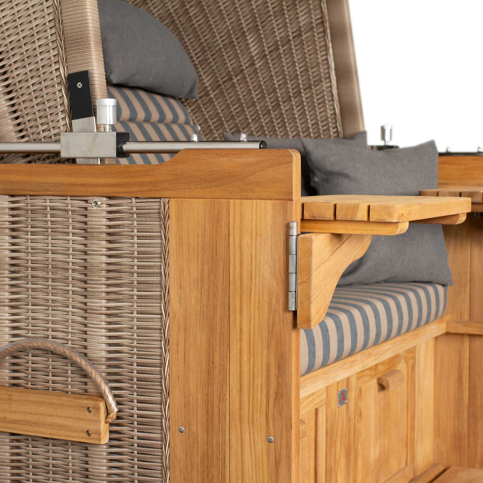 Das robuste Teakholz verleiht dem Strandkorb eine natürliche Schönheit und Langlebigkeit. Durch seine witterungsbeständigen Eigenschaften ist er ideal für den Außenbereich geeignet.