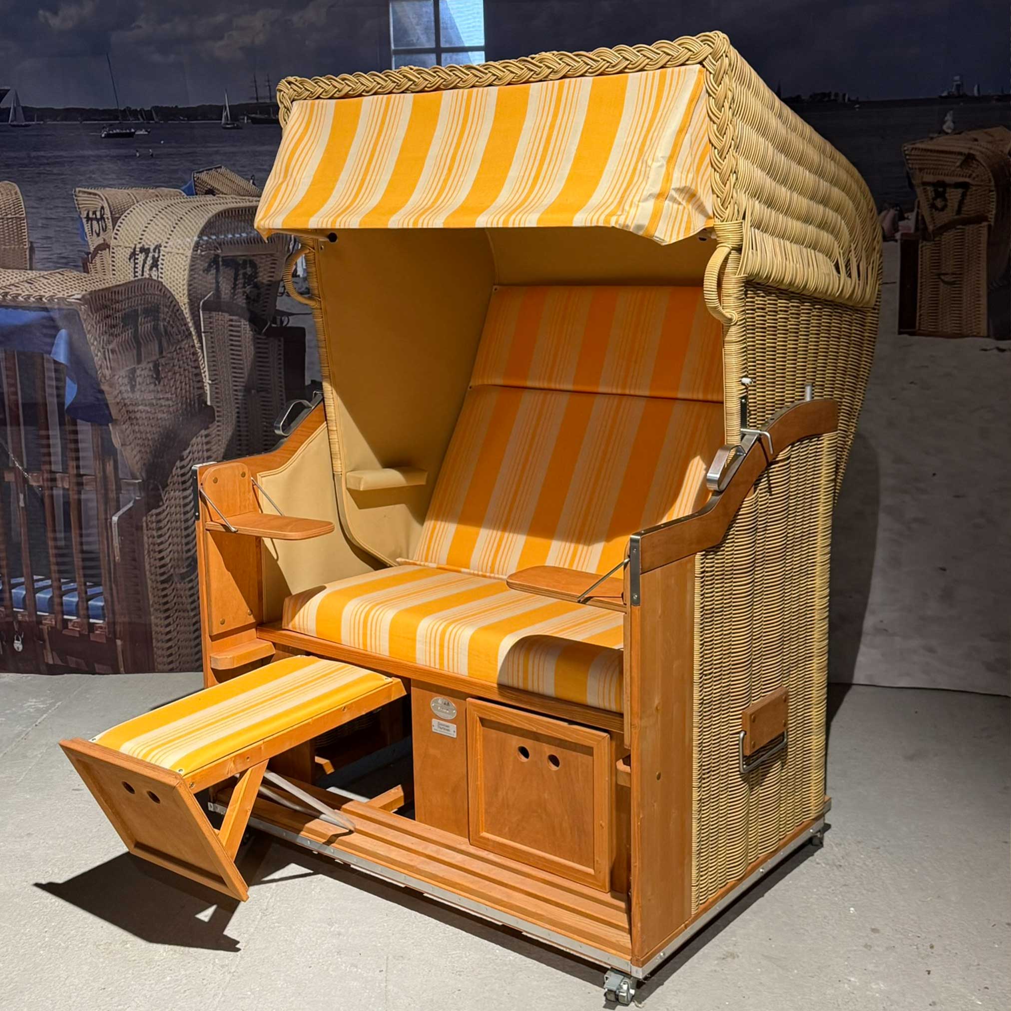 Strandkorb Sonnenpartner Modell Classic PE Rundgeflecht Naturoptik, Holz lasiert, Dessin gelb gestreift